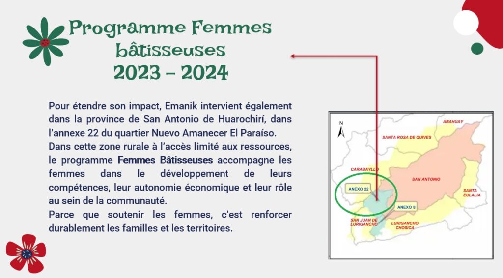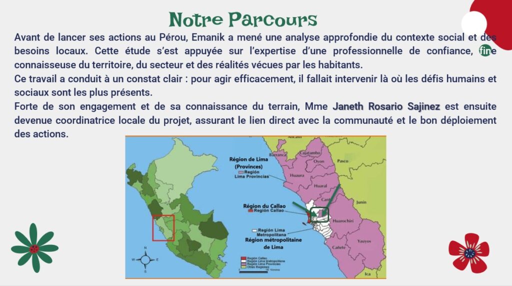 EMANIK a lancé ses premières actions au Pérou en collaboration avec des acteurs locaux. Ces initiatives ont répondu à des besoins sociaux identifiés directement sur le terrain.